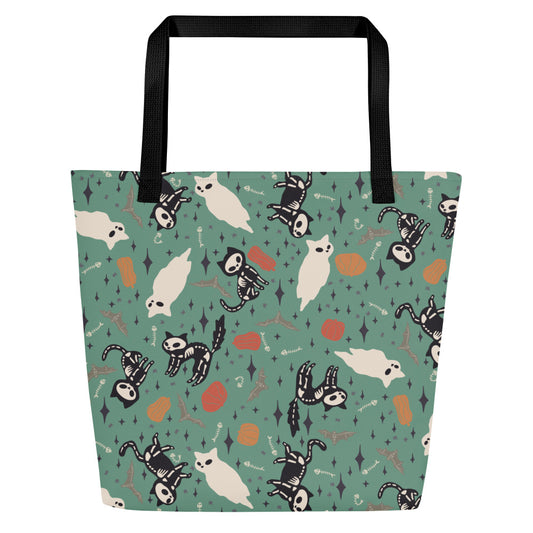 All-Over Print Large Tote Bag - SkeleCat - Green